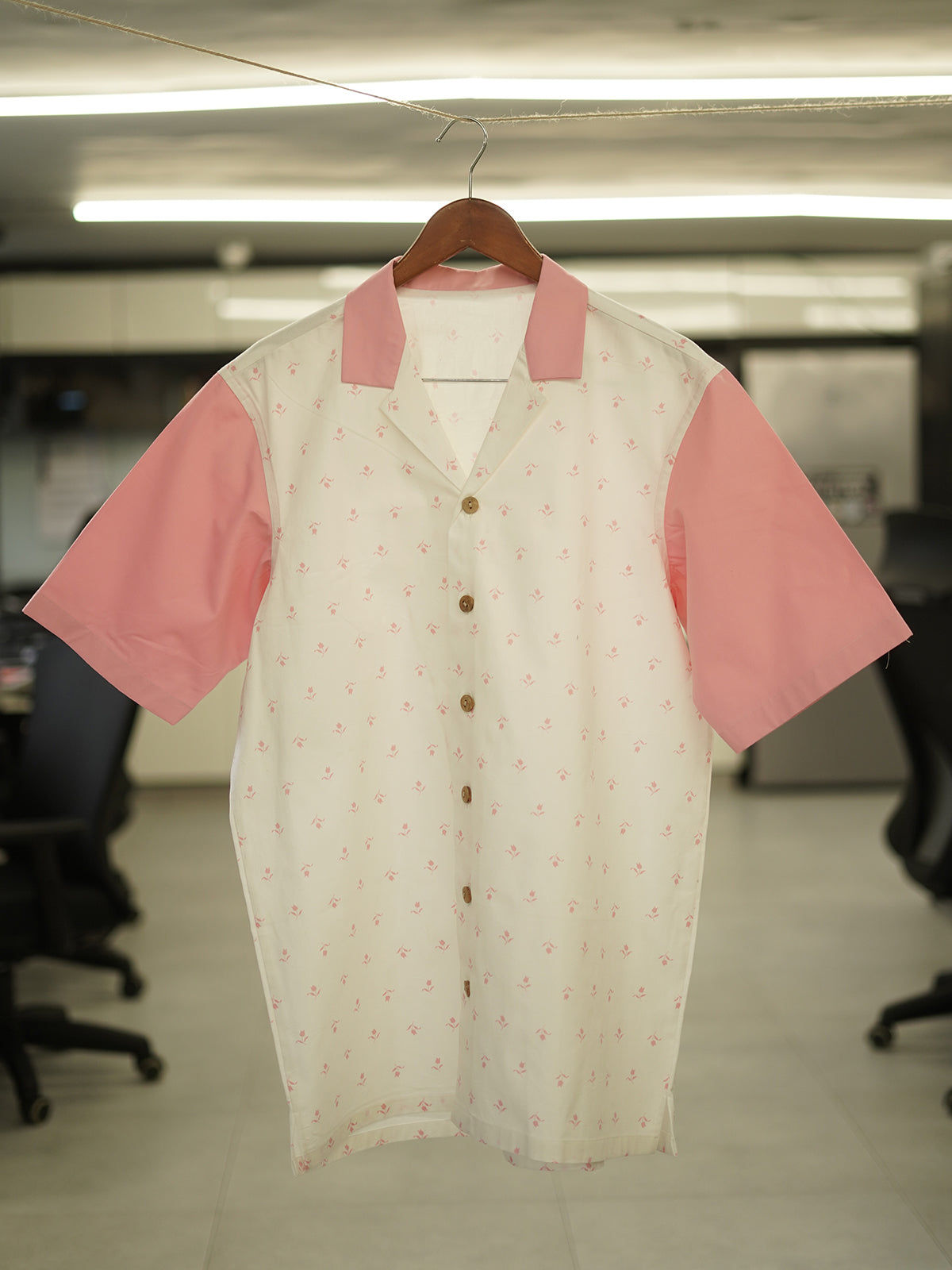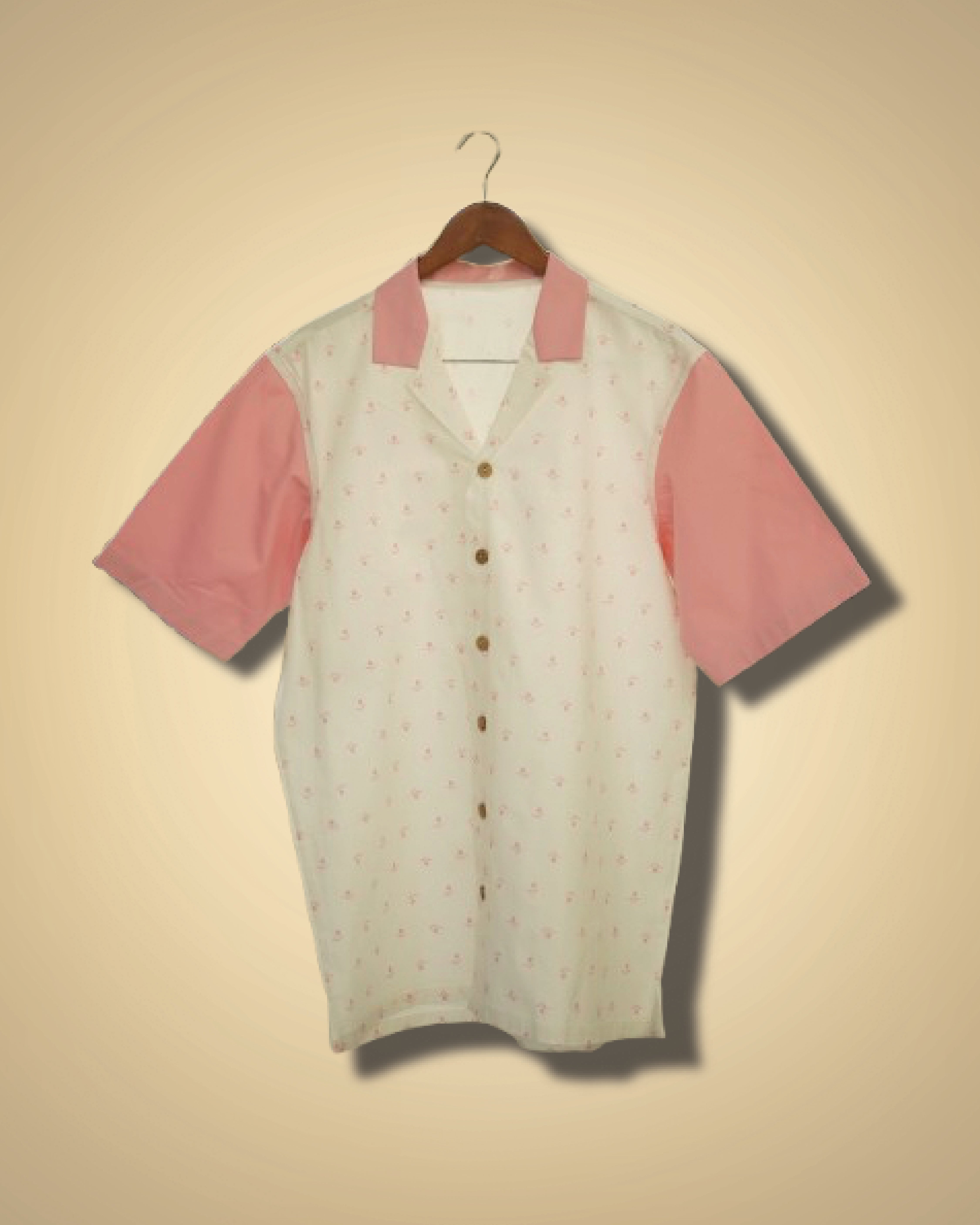 “Gulaabon ka Khat” is a minimalist romantic — a shirt that feels like a faded envelope tucked between pages of a diary. Featuring a tiny rosebud print on warm ivory cotton and framed in soft blush panels, it captures the charm of handwritten notes, first crushes, and quiet Sunday mornings.