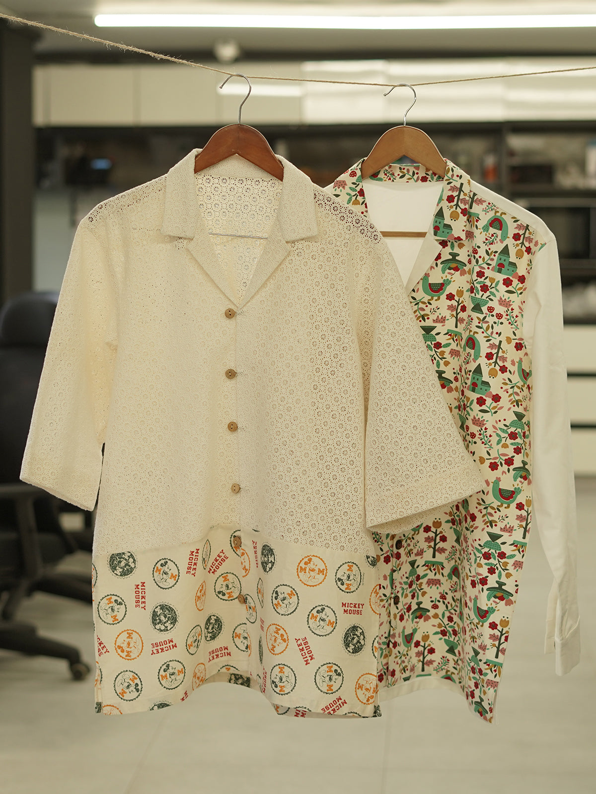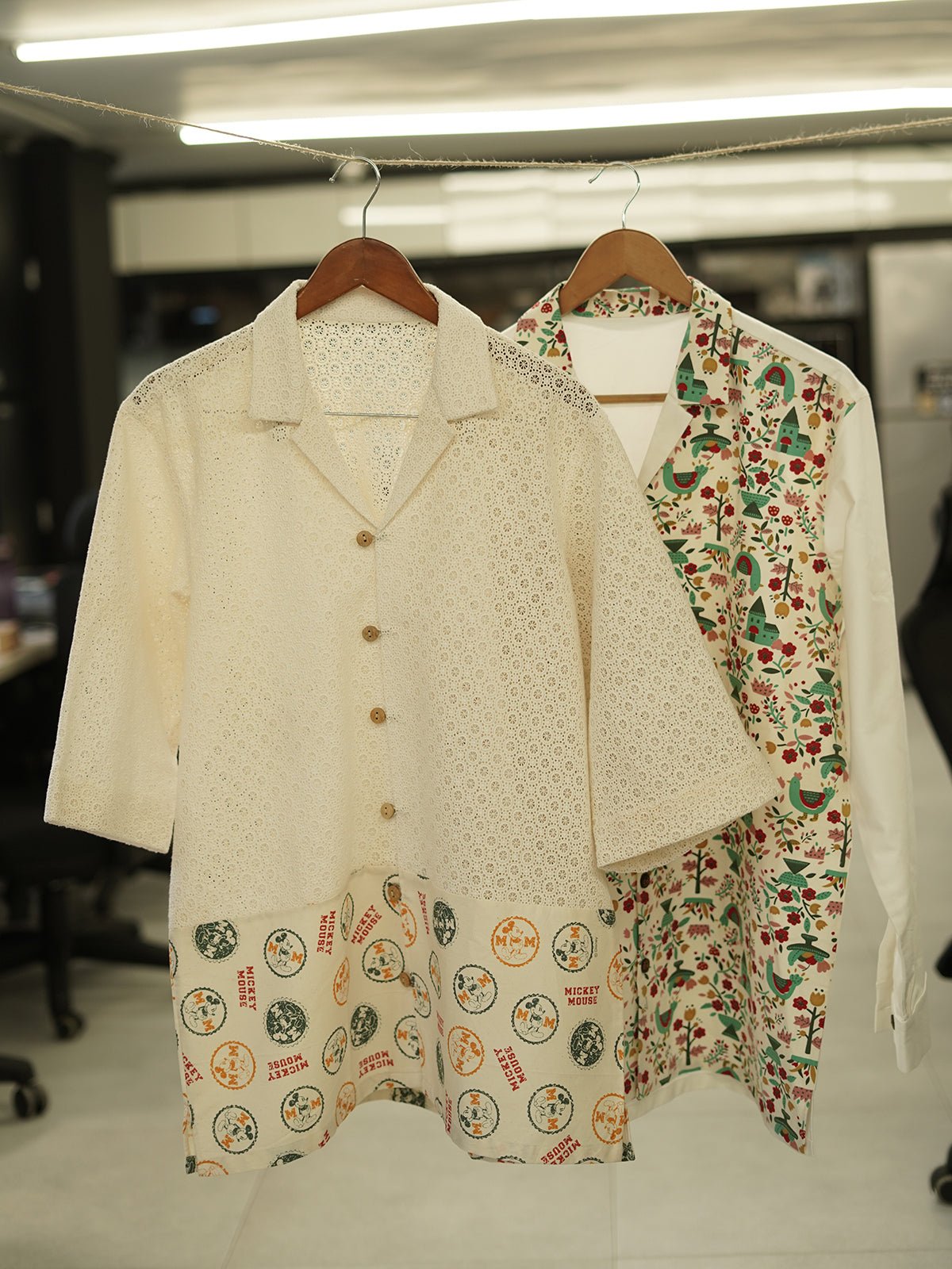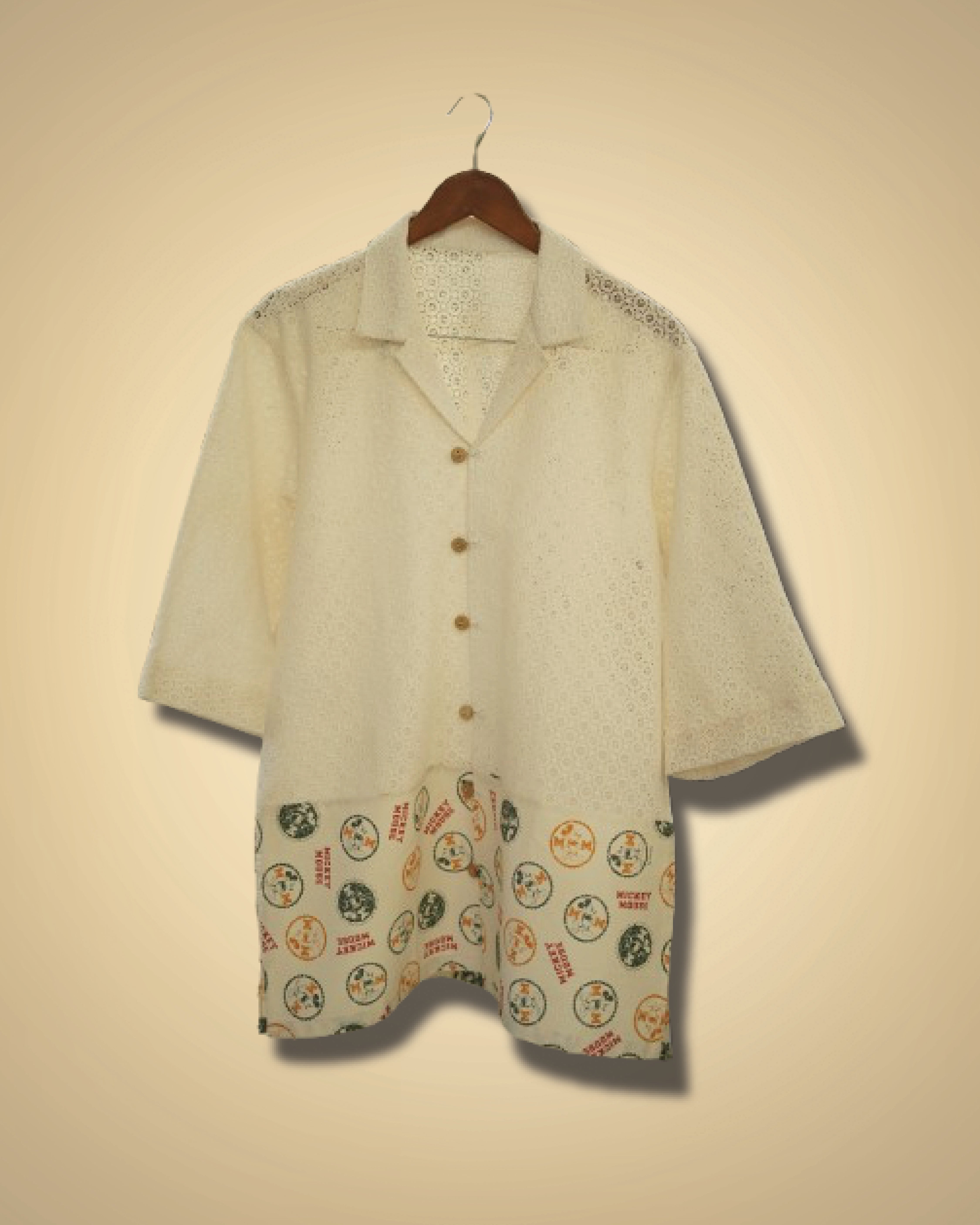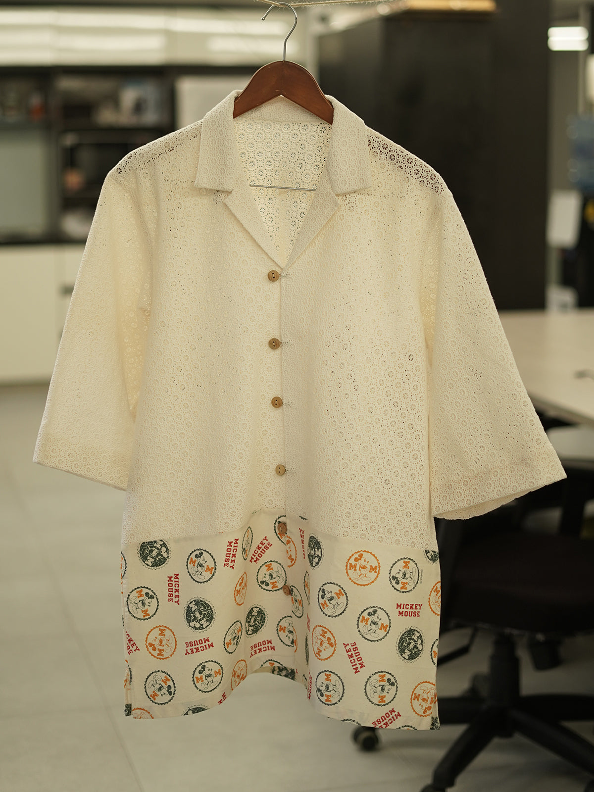 “Mickey Ki Mogra” is a whimsical, head-turning hybrid. It combines the refined elegance of vintage embroidered lace with the bold joy of stamped Mickey Mouse medallions in red, orange, and green. This shirt playfully blurs timelines — from 1940s Lucknow to 1980s Disneyland to 2025 Lahore.