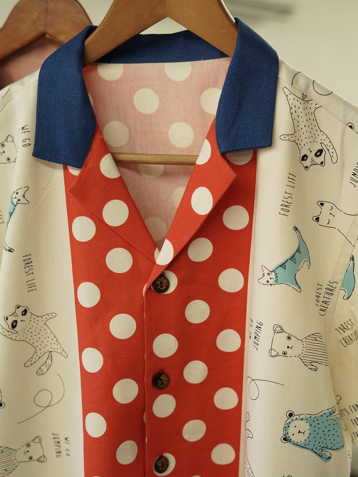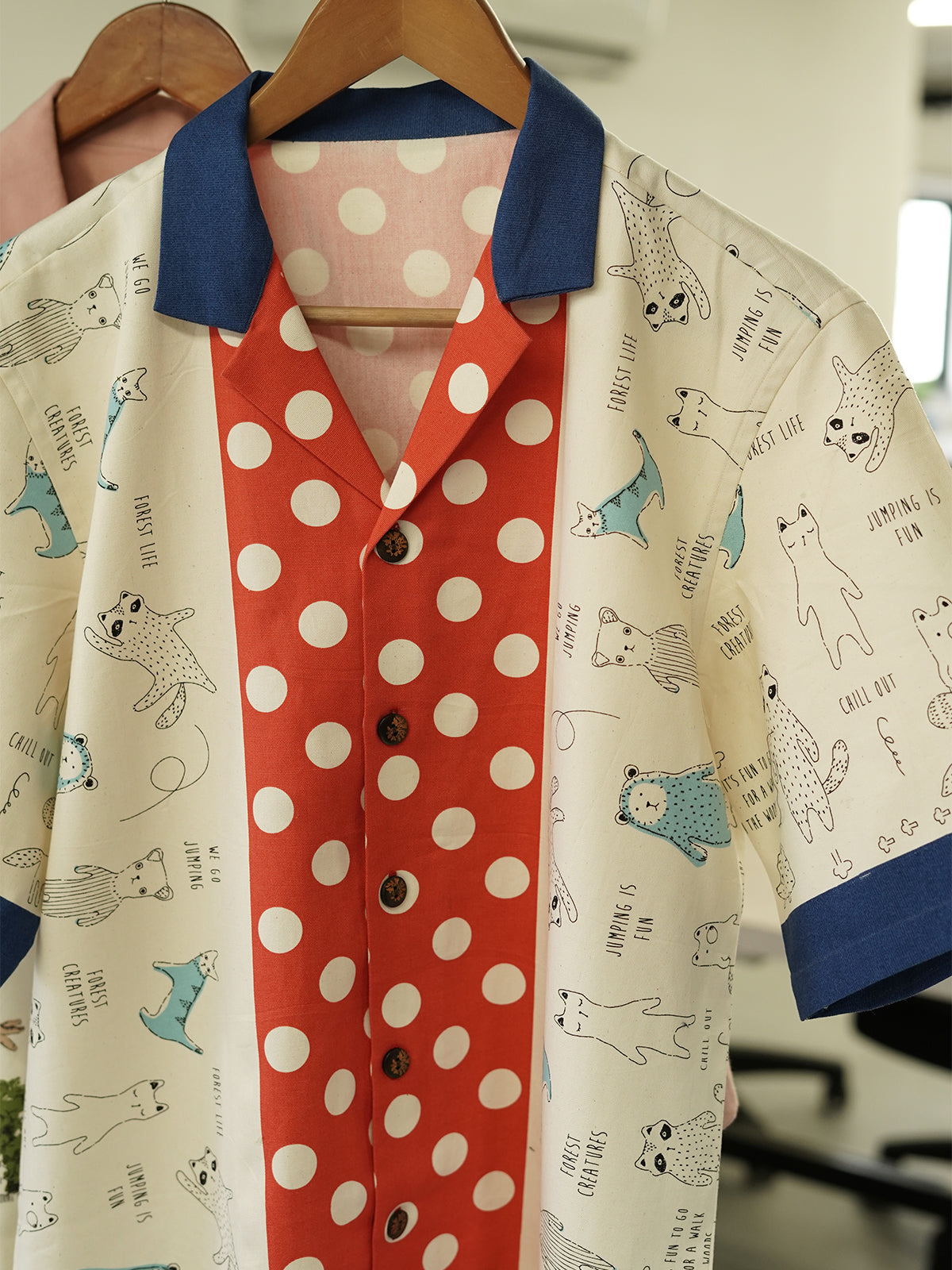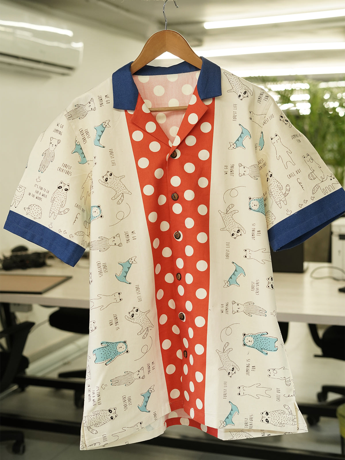 “Sketches & Dots” is a lighthearted escape into the sketchbooks of childhood — a world where polar bears go “jumping in joy”, “forest camping”, and tell you “chill out” when life gets too serious. The playful typography and illustrations are set against creamy panels and bold red polka dots, finished with a crisp navy Cuban collar and cuffs.