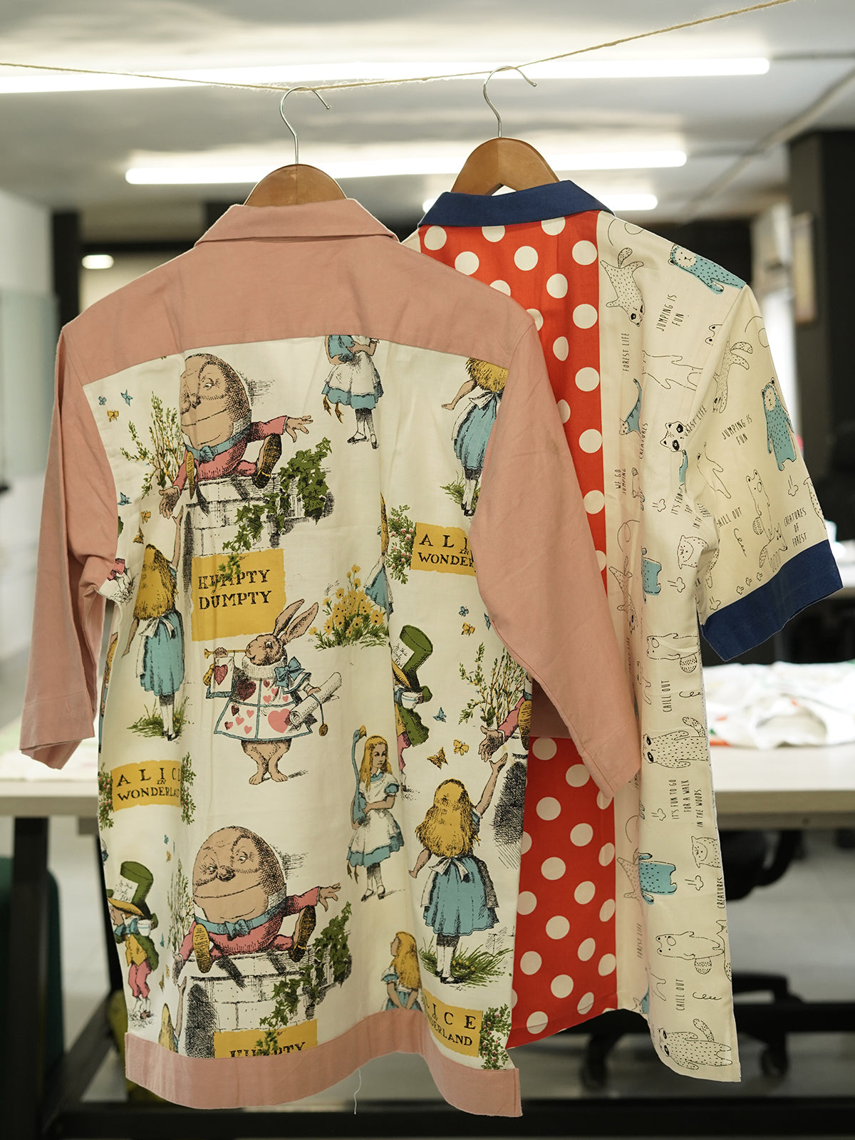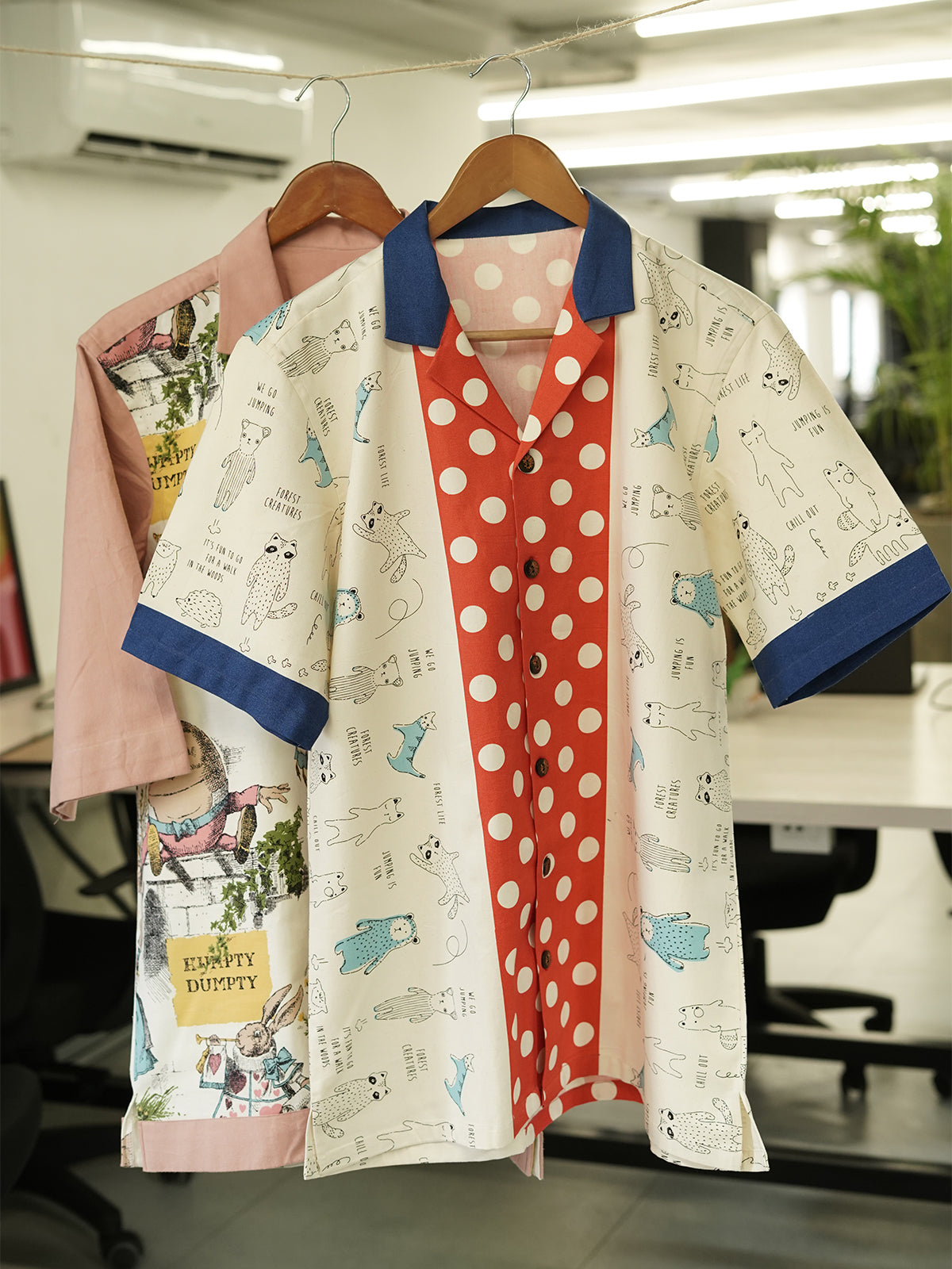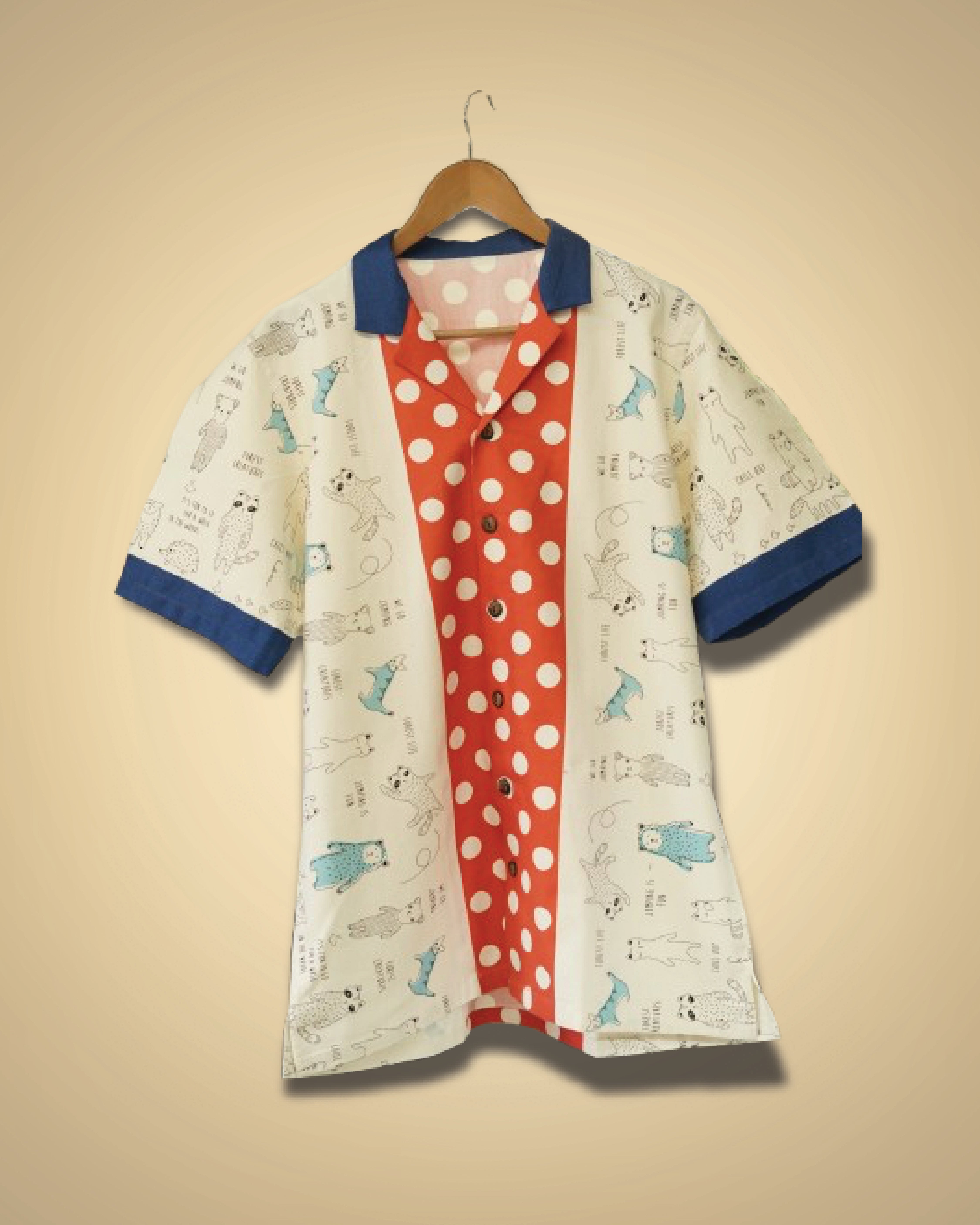 “Sketches & Dots” is a lighthearted escape into the sketchbooks of childhood — a world where polar bears go “jumping in joy”, “forest camping”, and tell you “chill out” when life gets too serious. The playful typography and illustrations are set against creamy panels and bold red polka dots, finished with a crisp navy Cuban collar and cuffs.