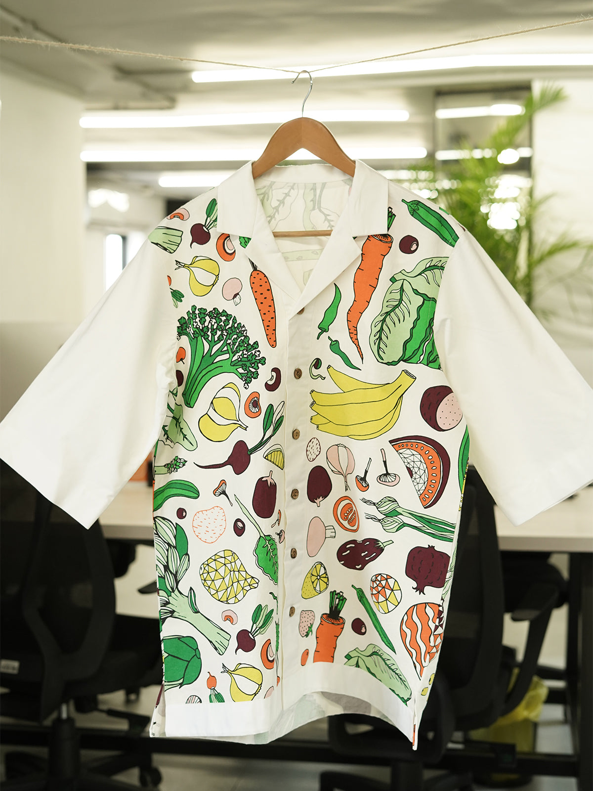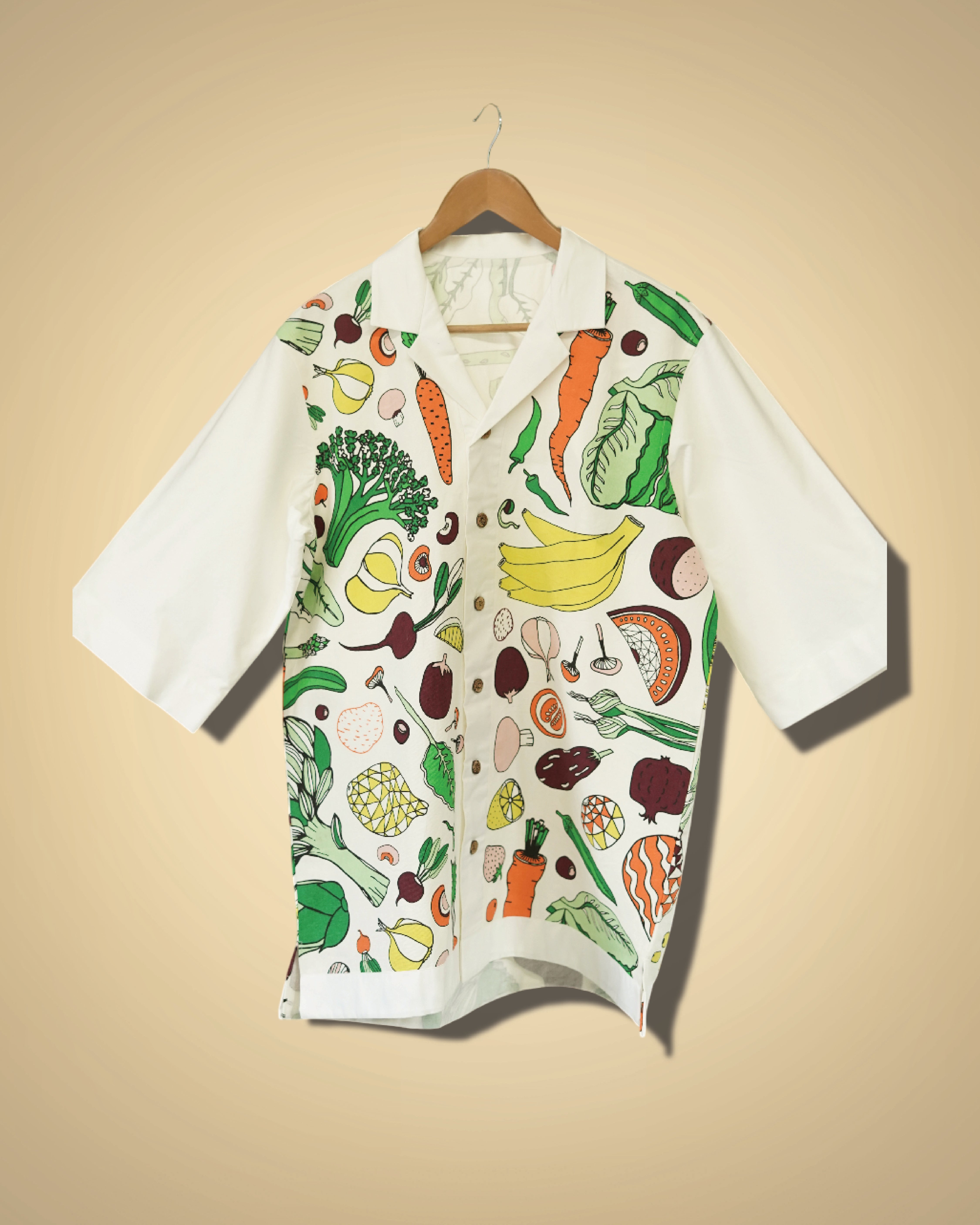 Paired with classic white sleeves and a crisp Cuban collar, it’s a wearable thali of flavor, fun, and found beauty.