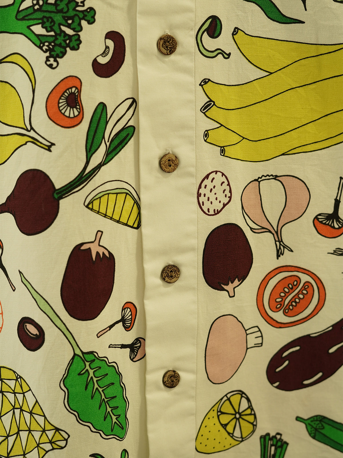 “Sunday at the Veggie Market” is stitched from a lively vintage textile brimming with illustrated vegetables, fruits, and kitchen joy — bananas, carrots, onions, beets, leeks, even lychee! Think childhood trips to the market with Amma, fingers dyed with mehndi, and the sound of steel thaalis clinking in the kitchen.