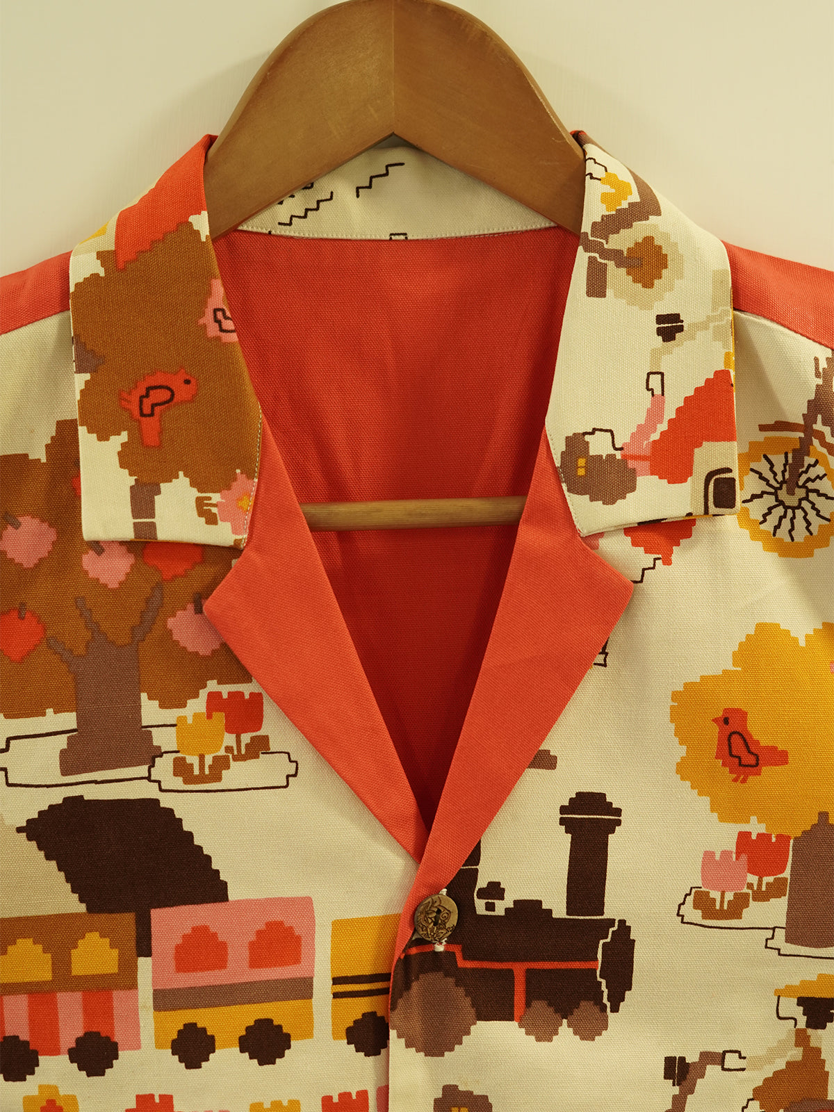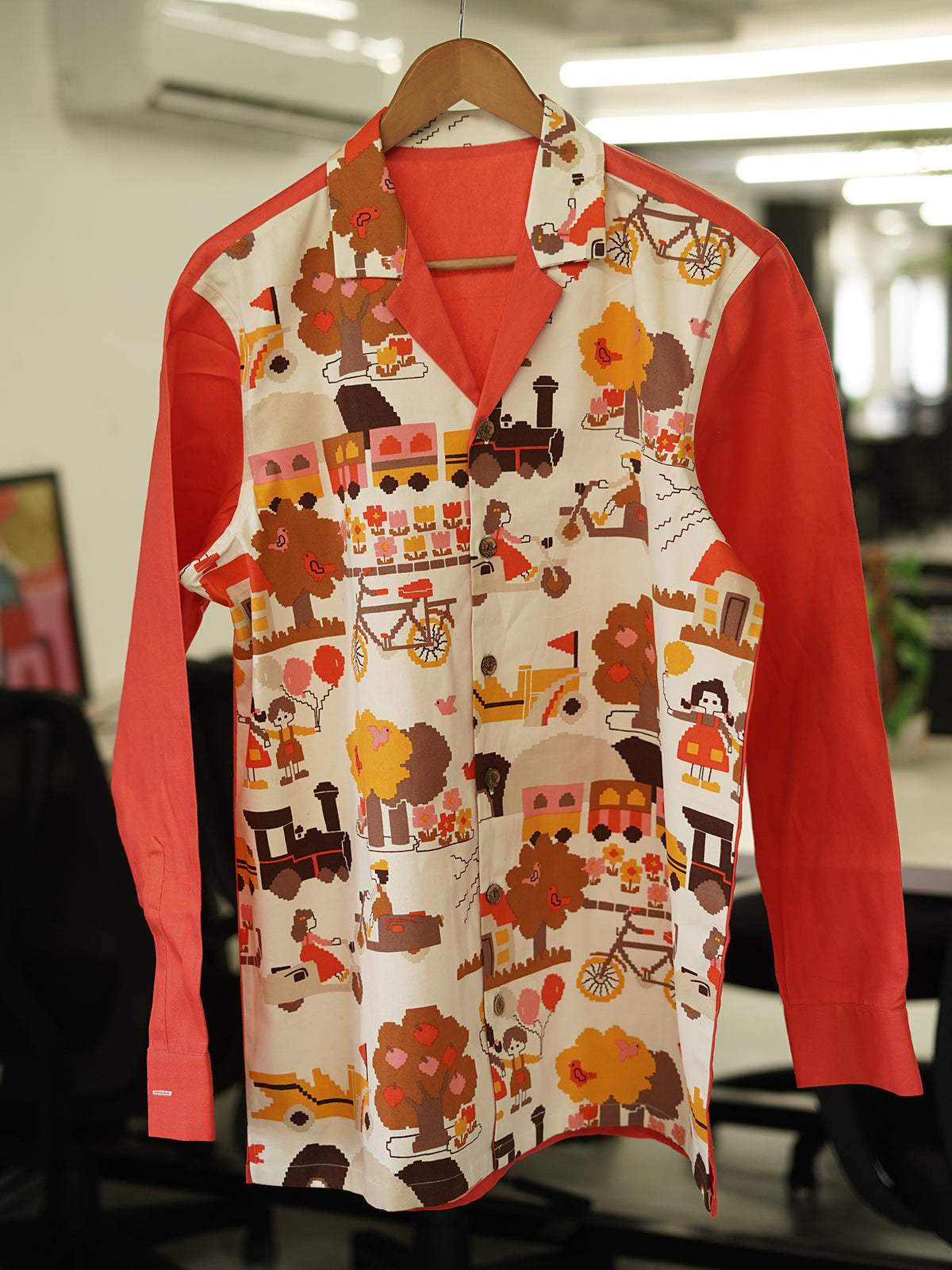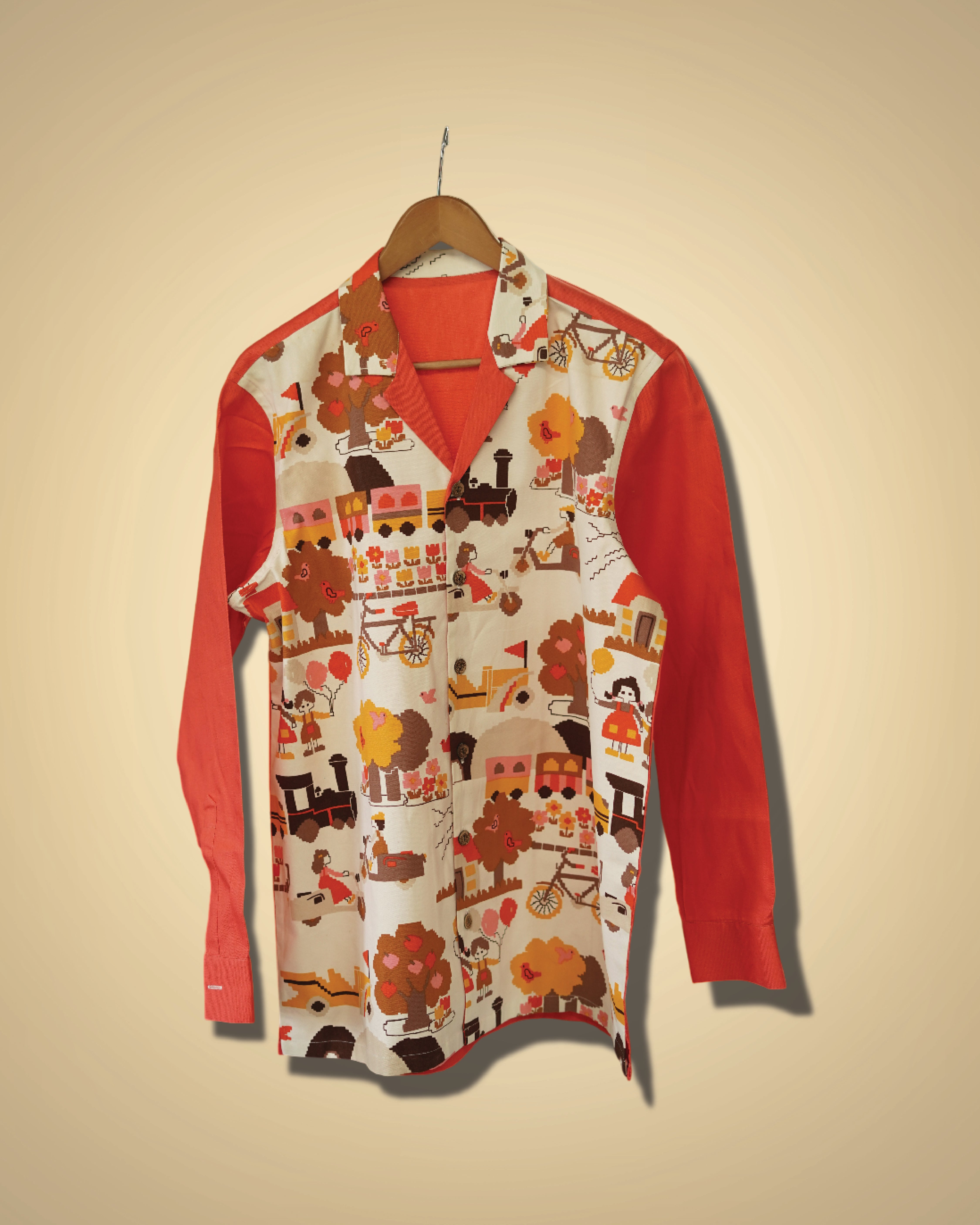 ‘The Bygone Train’ is crafted from a whimsical, vintage textile depicting a playful cityscape — bicycles, lantern trees, candy carts, and a puffing train that seems to chug right out of memory. Framed by warm, earthy red sleeves, the shirt revives forgotten joyrides, balloon sellers, and childhood fairs — stitched into a wearable postcard from the past.