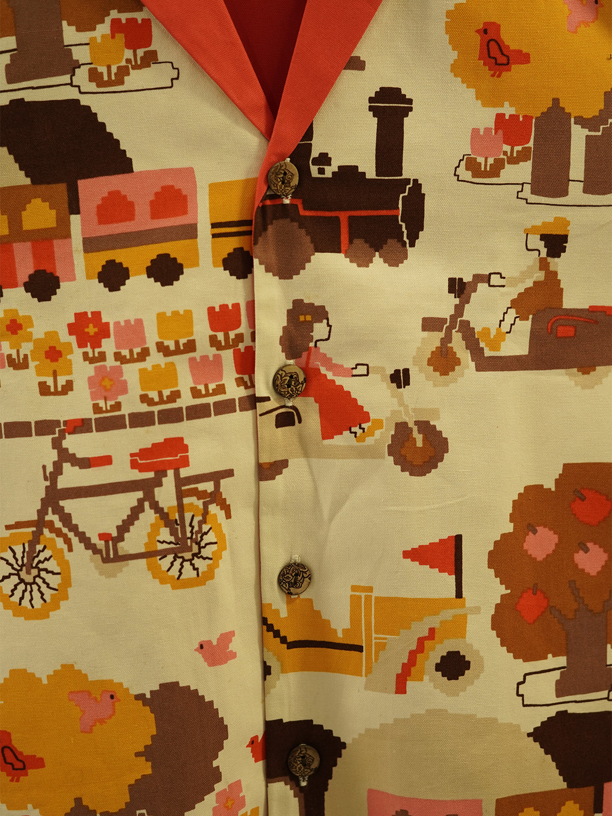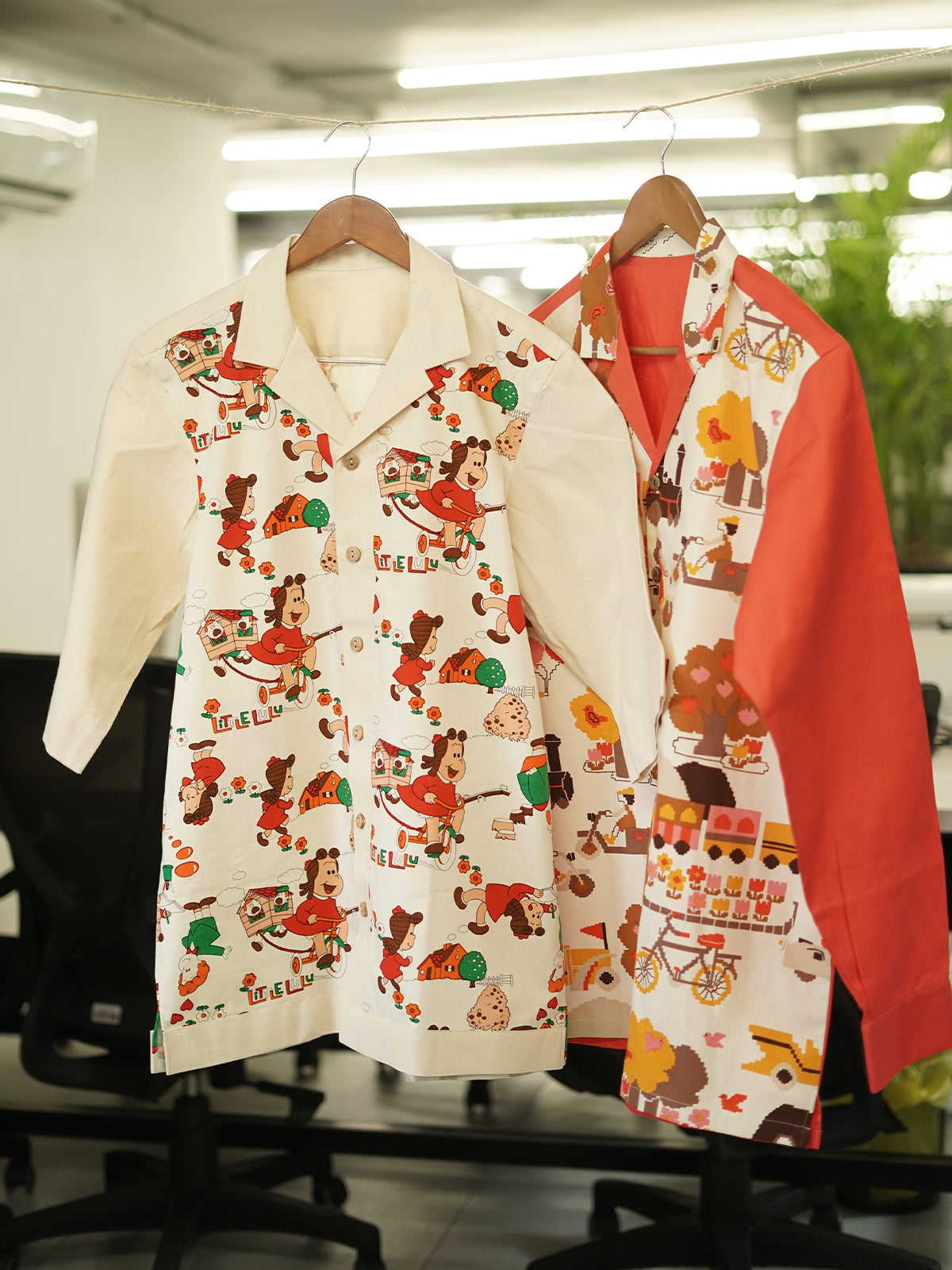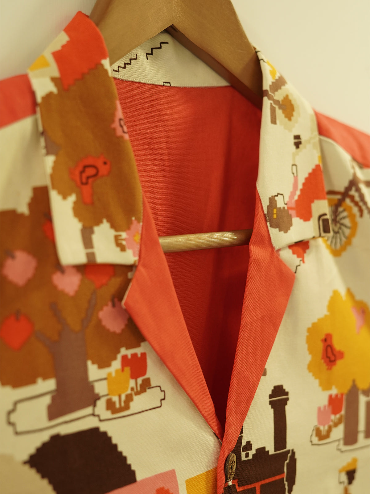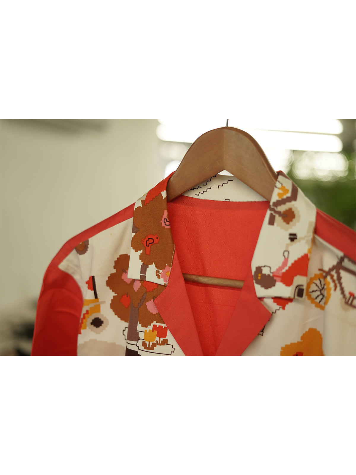 ‘The Bygone Train’ is crafted from a whimsical, vintage textile depicting a playful cityscape — bicycles, lantern trees, candy carts, and a puffing train that seems to chug right out of memory. Framed by warm, earthy red sleeves, the shirt revives forgotten joyrides, balloon sellers, and childhood fairs — stitched into a wearable postcard from the past.