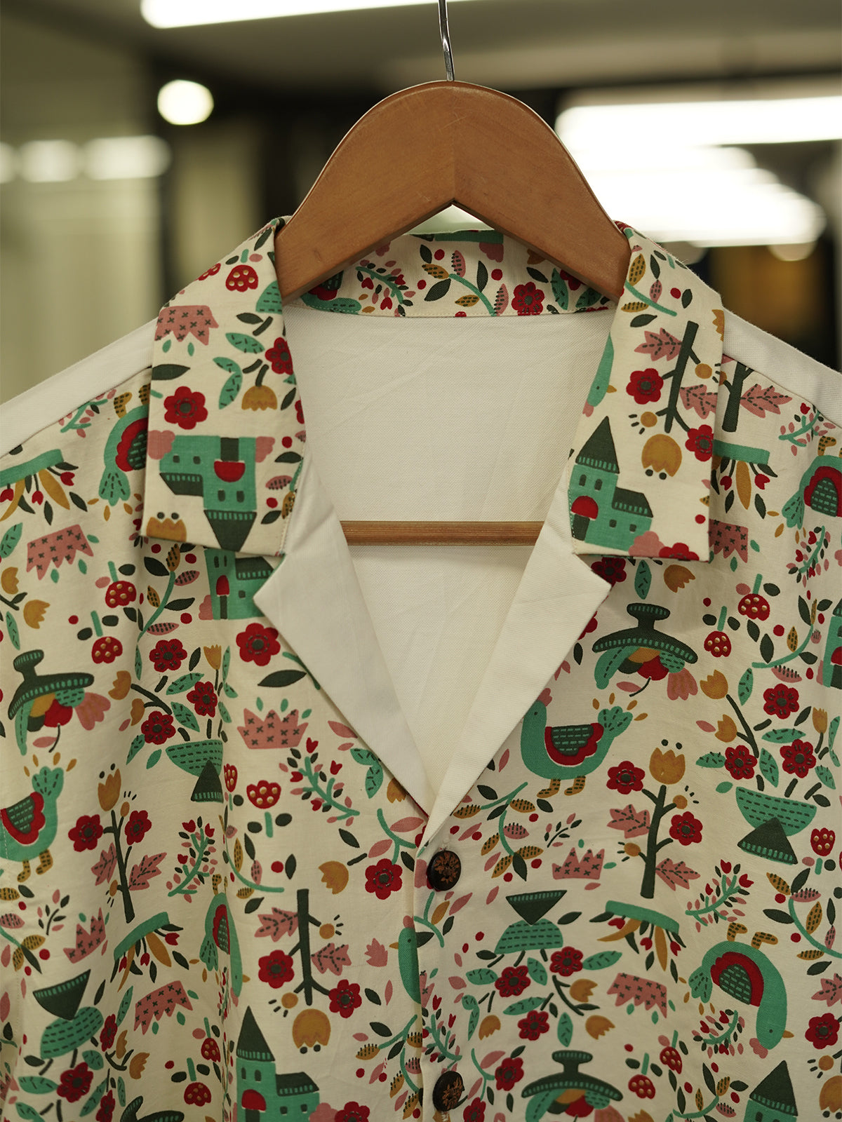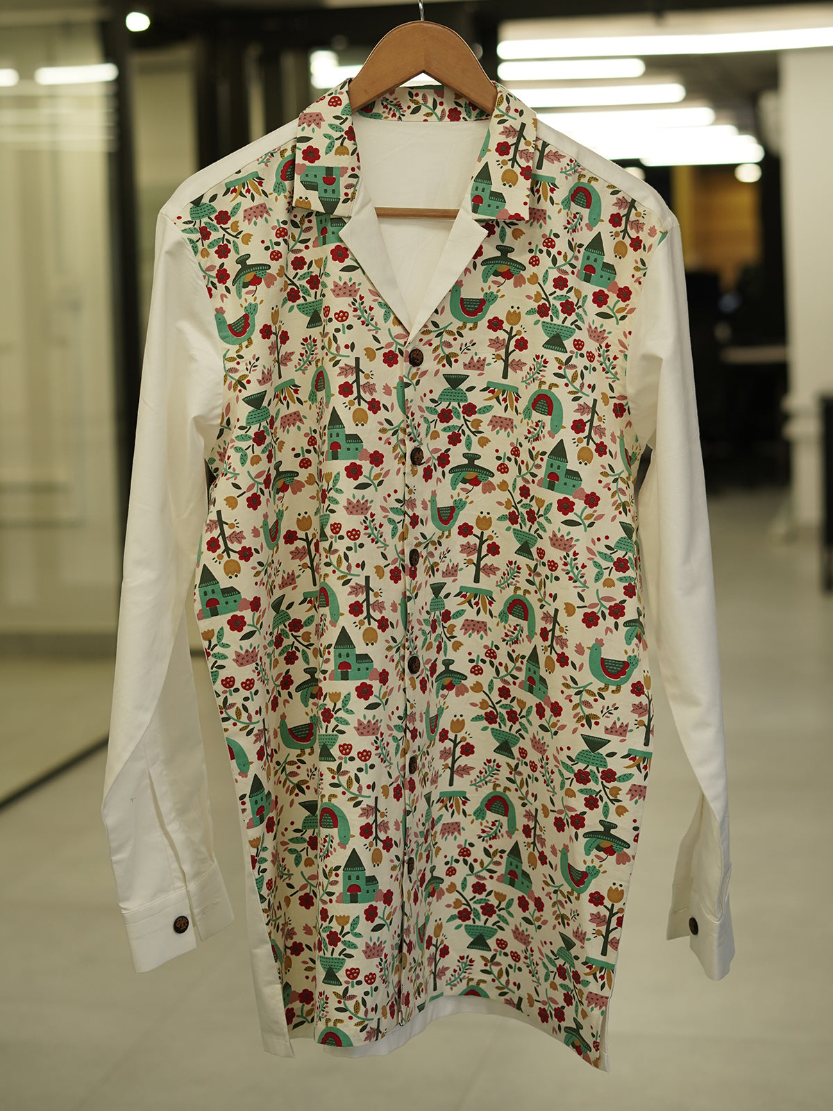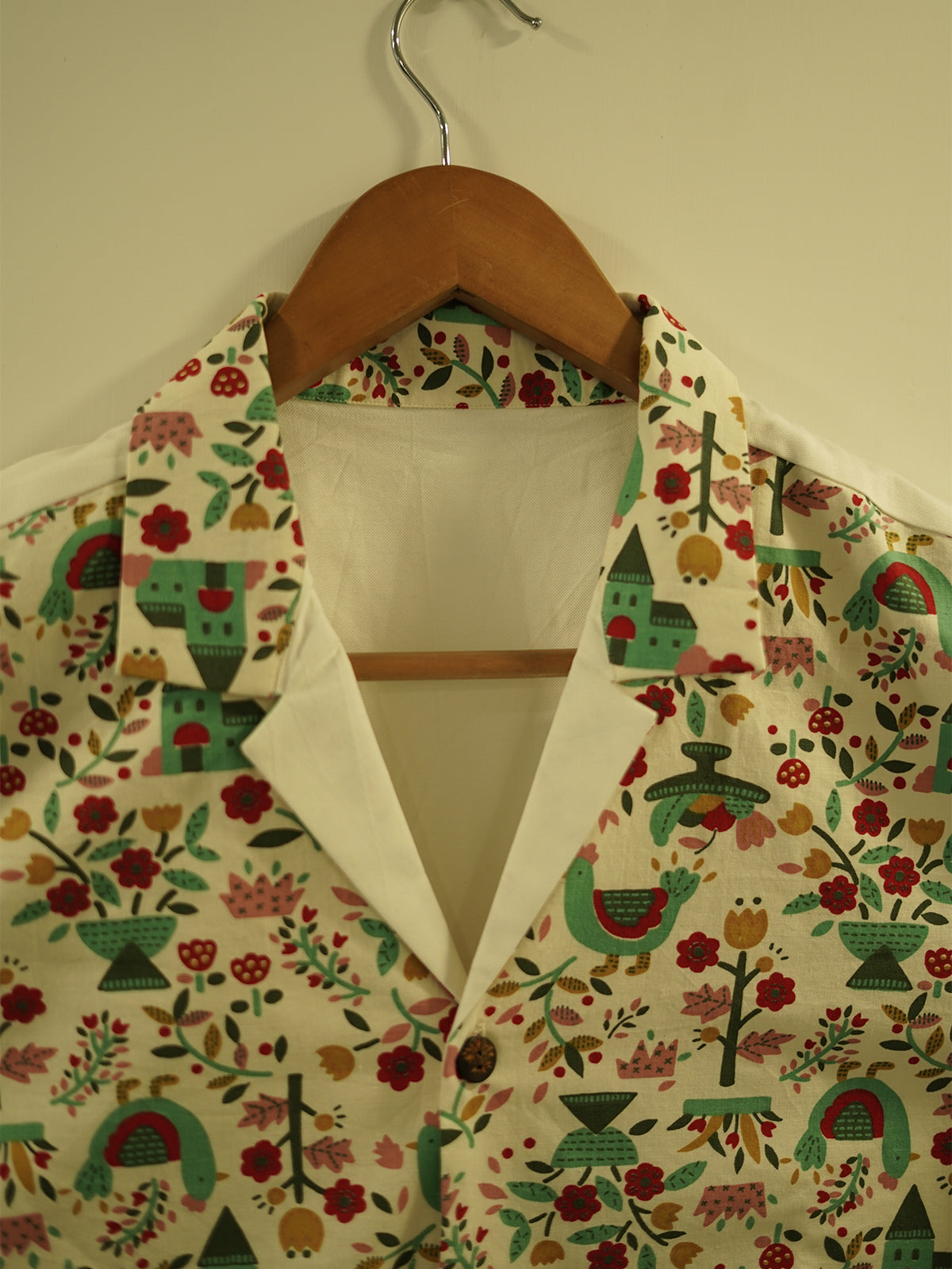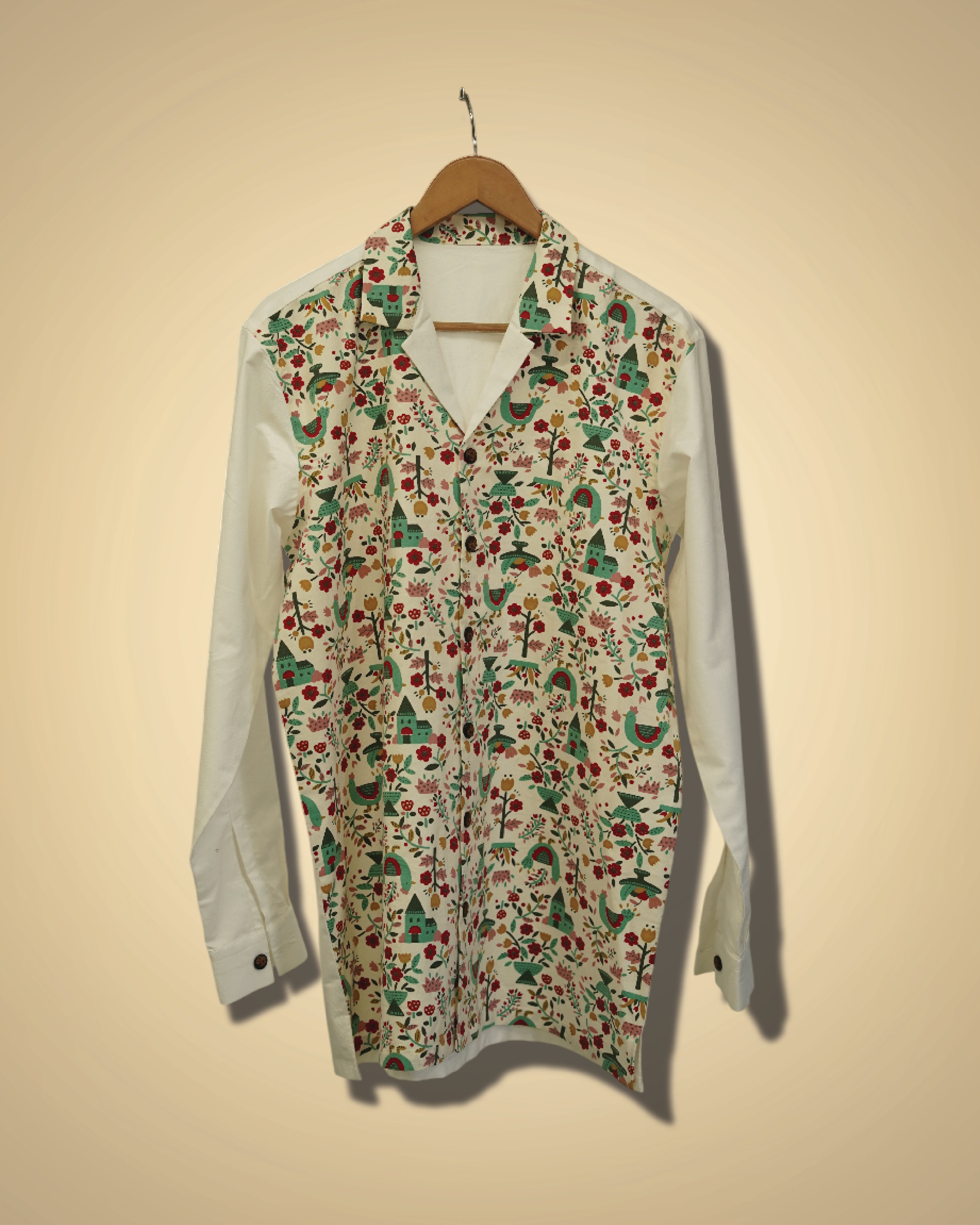 “Sheher-e-Naqsh” is a tribute to childlike wonder — a shirt where tiny green doves, red berries, mustard tulips, and moss fountains build a whimsical garden city. The structured grid-like pattern evokes the charm of embroidered phulkari, Scandinavian folk art, and pre-digital children’s books — reimagined on soft vintage cotton and stitched with love.