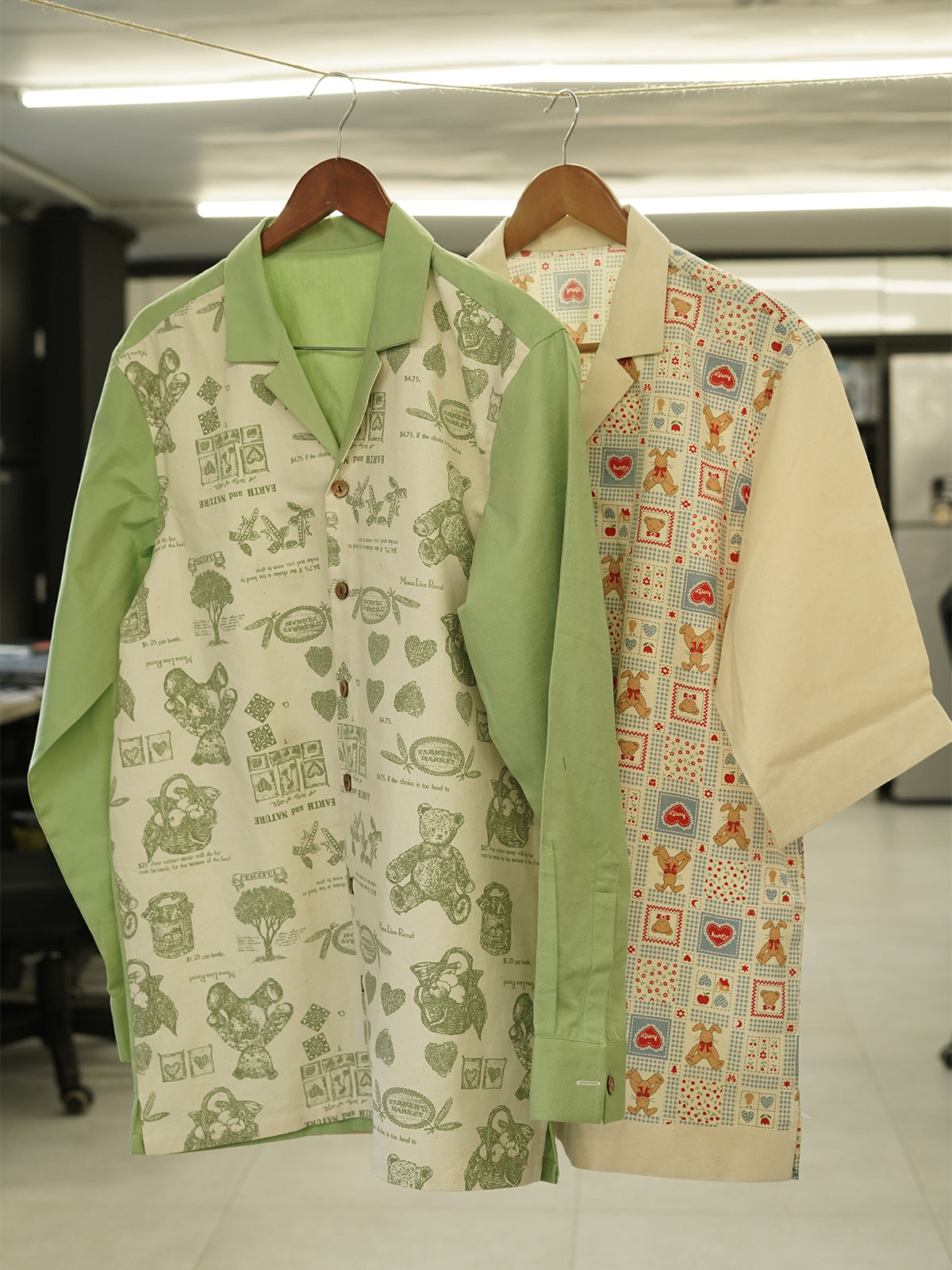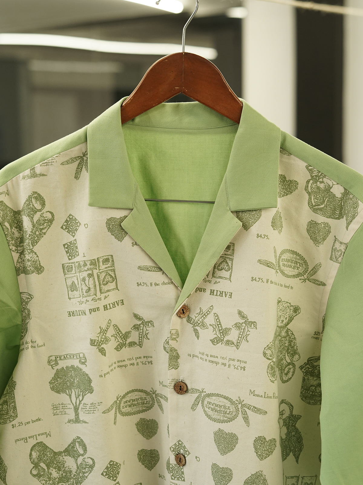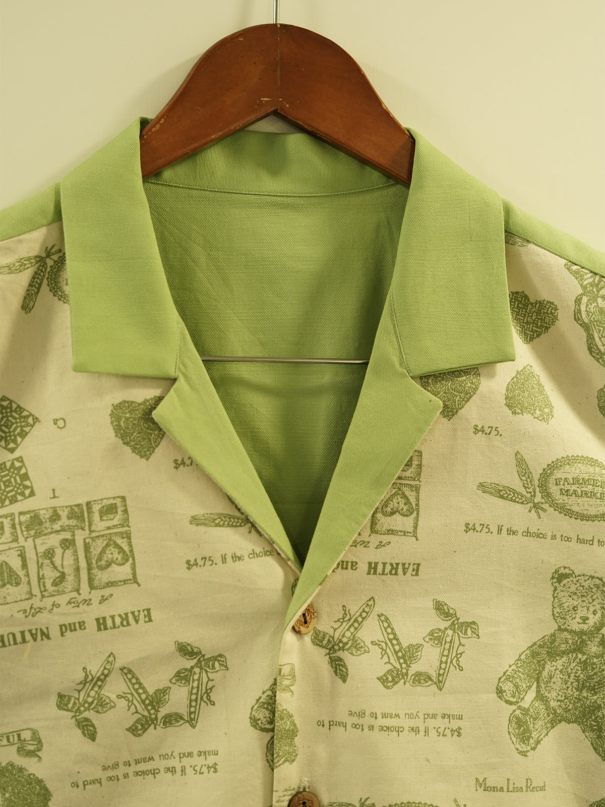 “Bagh ki Diary” is a shirt that feels like a page from a forgotten journal — filled with sketches of wildflowers, jam jars, old trees, and teddy bears waiting in wicker baskets. A rare vintage print paired with sage green sleeves and a Cuban collar, this piece whispers of Sunday mornings, hand-written letters, and peaceful silences under mulberry trees.